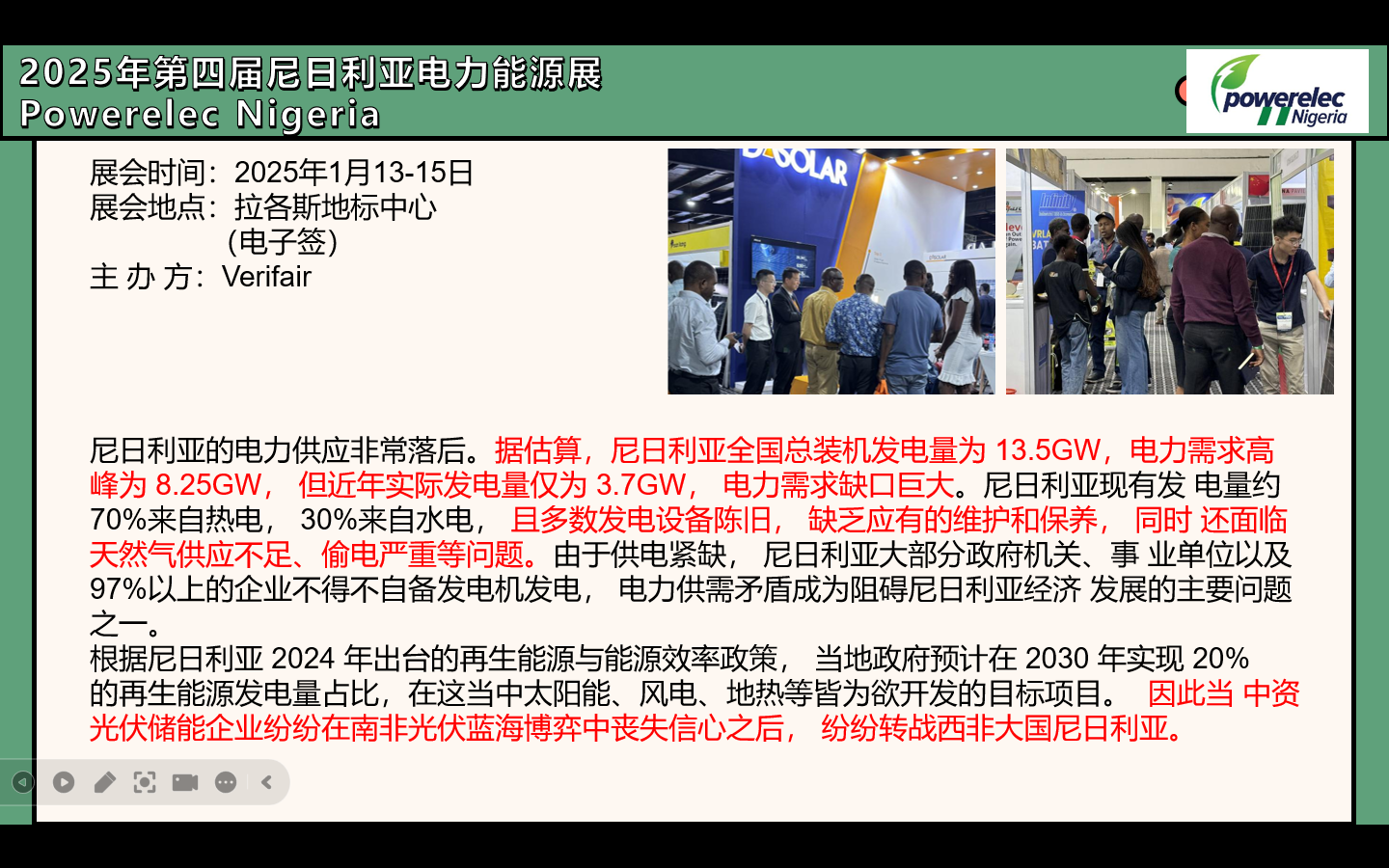 展会展览面积达到11000平米,预计参展观众数量达到24000人,同时展会吸引约450家展商和30,000名专业观众前来参展,250余人展会发表主题演讲,探讨未来能源发展和行业现状。展会开展时电力供应商、太阳能项目负责人和开发商及来自政府和监管机构和电力公用事业等专业人士都将来到展会现场。