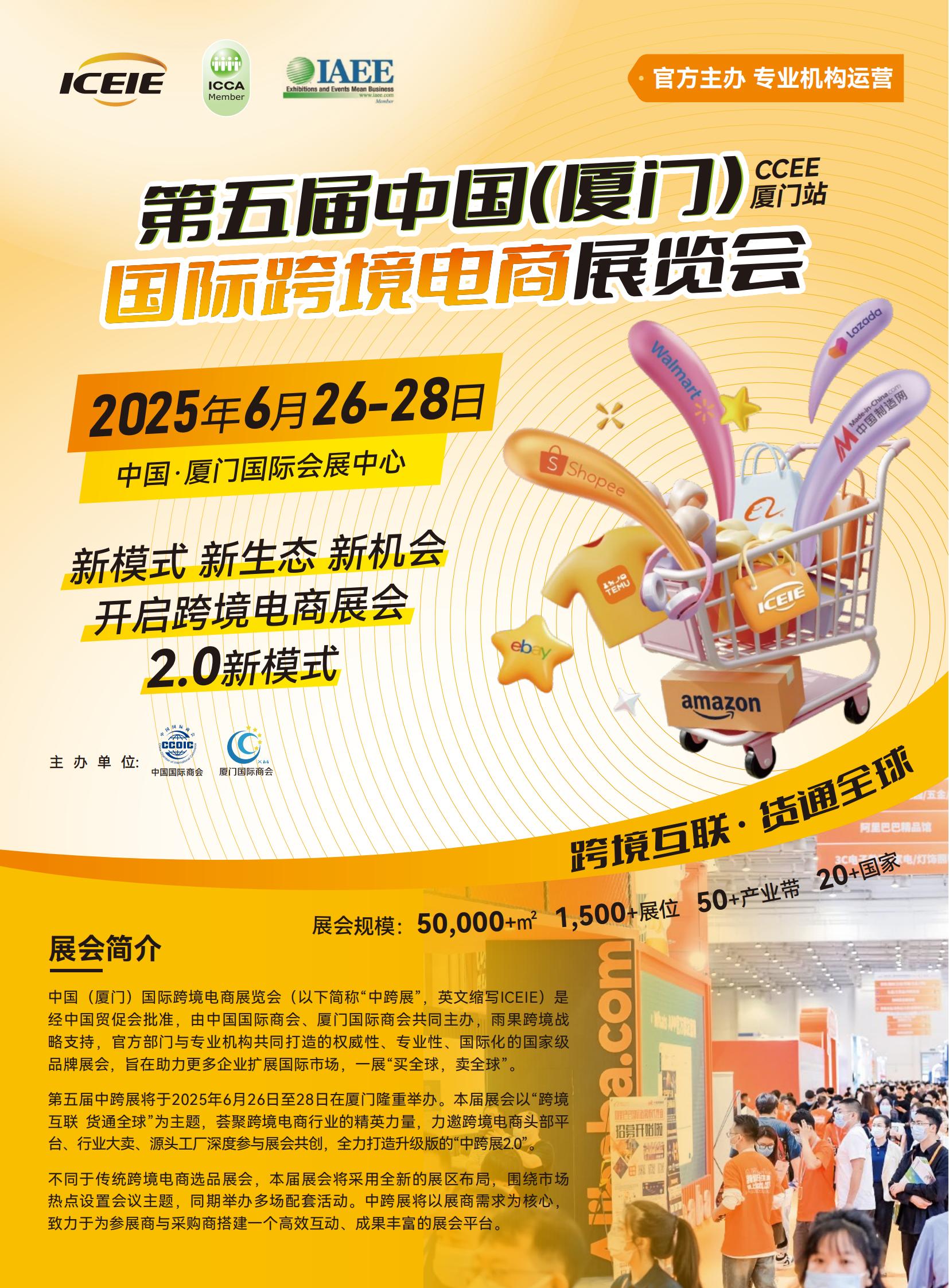 中国(厦门)国际跨境电商展是由中国国际商会、商务部外贸发展事务局、厦门市贸促会、厦门国际商会共同主办的权威性、国际性、专业性国家级服务贸易展。累计覆盖全球40多个国家和地区,近15万名境内外客商参会,集中展示全国50多个优质产业带。 作为国内知名的大型专业跨境电商展览会,中跨展充分发挥官方主办专业机构运营的优势,通过汇聚全国贸促系统和商务系统资源,整合海内外大量权威电商平台和全领域服务商,集结全品类优质跨境专供企业,不仅帮助中国供应商通过跨境电商渠道开拓海外市场,同时引进合适的国际品牌落地中国市场,为供应商和品牌商提供全面而高效的商贸对接平台,服务国家构建国内国际双循环新发展格局。 举办中跨展是中国坚定支持贸易自由化和经济全球化、构建以国内大循环为主体、国内国际双循环相互促进的新发展格局的重要举措,为世界各国开展跨境电商贸易合作搭建了开放型合作平台,推动开放型世界经济发展。