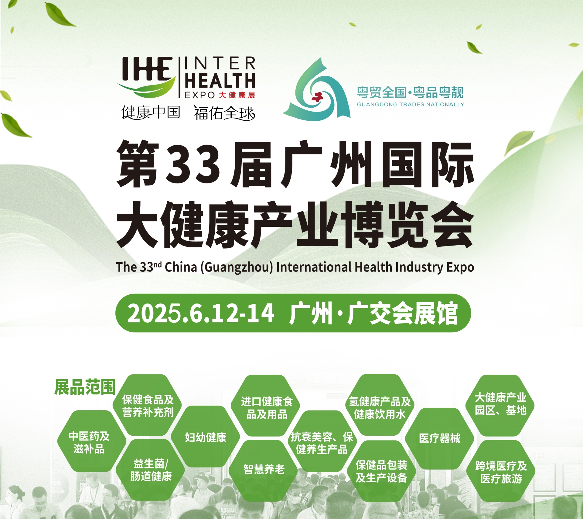 2025第33届广州国际大健康产业博览会预计将有千余家品牌商参展,参展品类包括:健康食品及营养补充剂、进口食品及用品、中医药及滋补品、智慧养老、氢健康产品及健康饮用水、家庭医疗设备、妇幼健康、益生菌及肠道健康、跨境医疗及医疗旅游、生物制品及抗衰美容及睡眠健康、大健康产业园区及基地、包装及生产设备等,全球商机,一展触达。